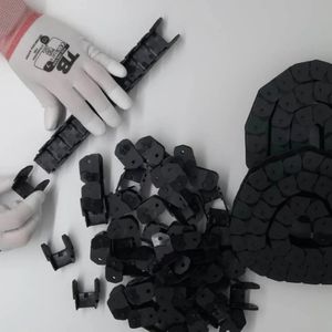 Manual assembly of modular plastic links of the cable carrier chain type, focused on organisation, controlled flexibility and correct articulation for mechanical and industrial automation systems.